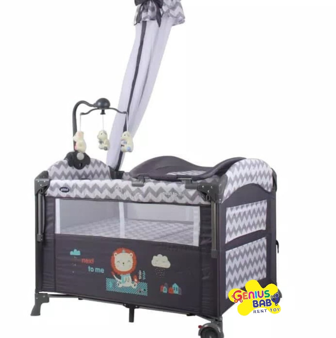 Pliko Next to Me hadir dengan 3 mainan gantung berputar untuk menghibur dan panel elektronik (music, suara, cahaya dan getar) untuk membuai bayi kecil Anda.